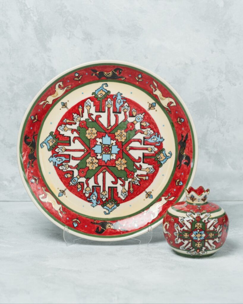 Qarabağ atları və xalça məktəbinə məxsus olan “Çələbi” kompozisiya elementlərindən istifadə olunmuş dekorativ boşqab və nar kompozisiyası həndəsi ornament elementləri, o cümlədən stilizə olunmuş at təsvirinin ahəngindən yaranmışdır.